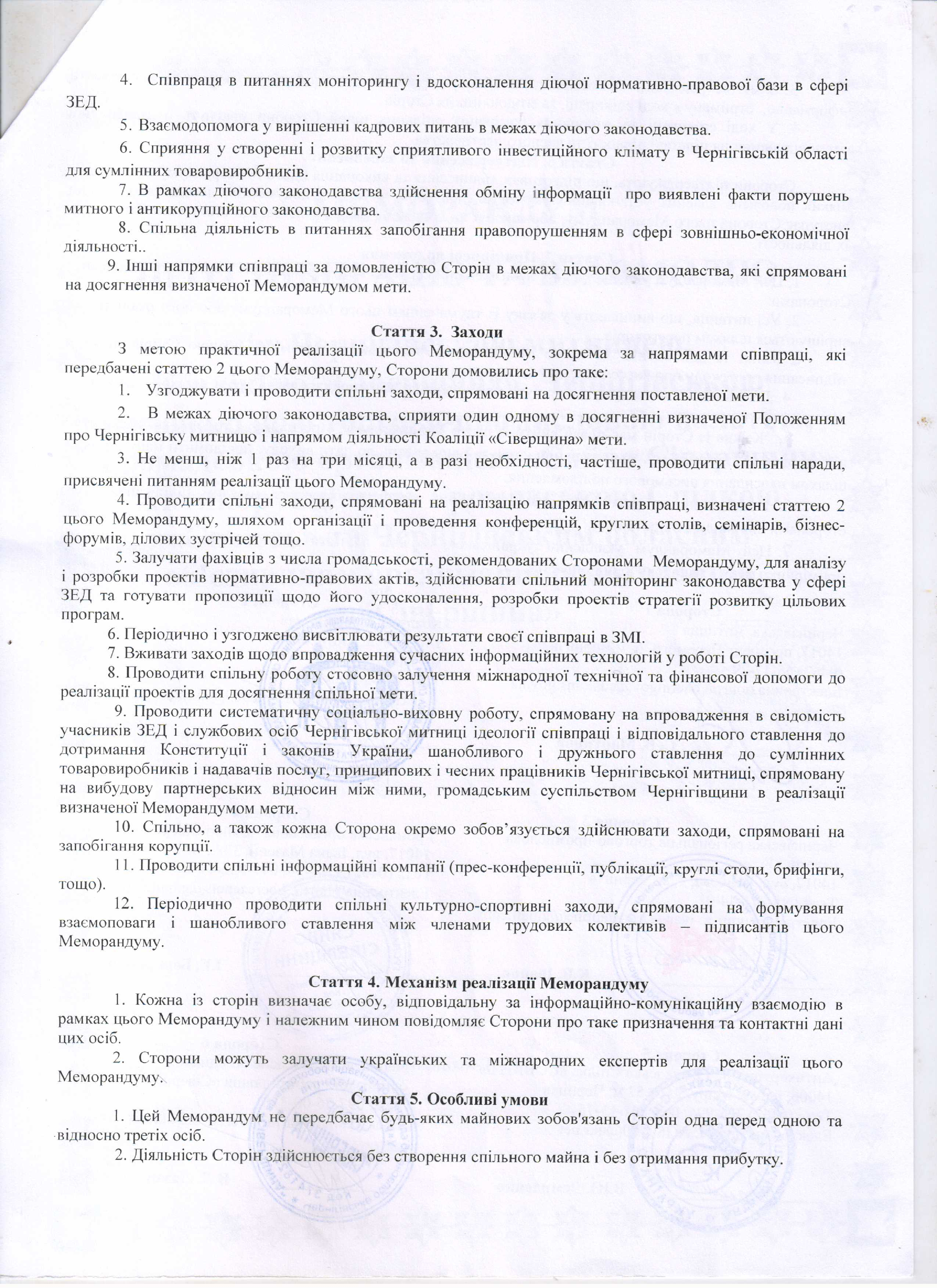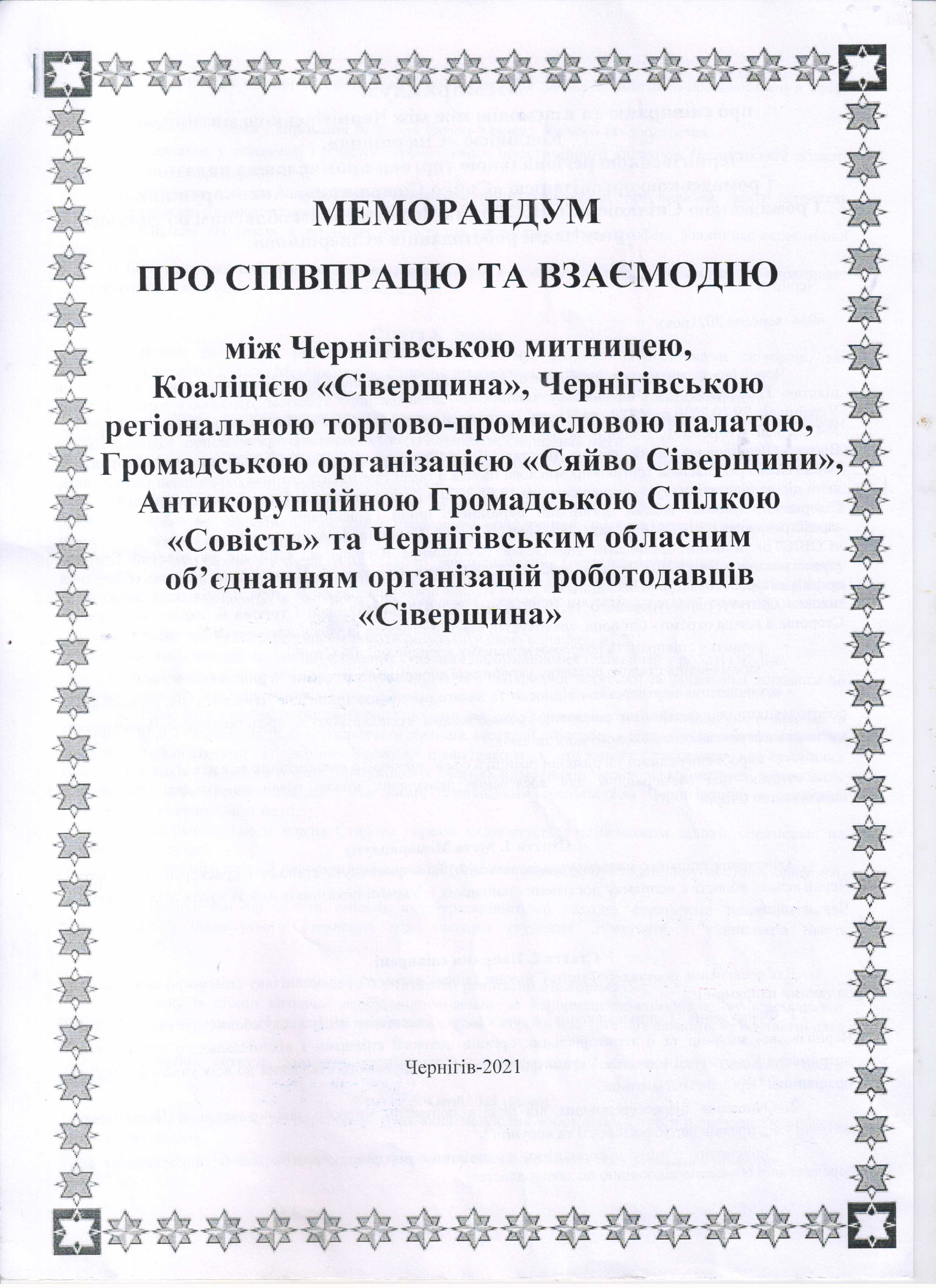 1.1.17. МЕМОРАНДУМ ПРО СПІВПРАЦЮ ТА ВЗАЄМОДІЮ між Чернігівською митницею, Коаліцією «Сіверщина», Чернігівською регіональною торгово-промисловою палатою Громадською організацією «Сяйво Сіверщини» Антикорупційною Громадською Спілкою «Совість» та Чернігівськ