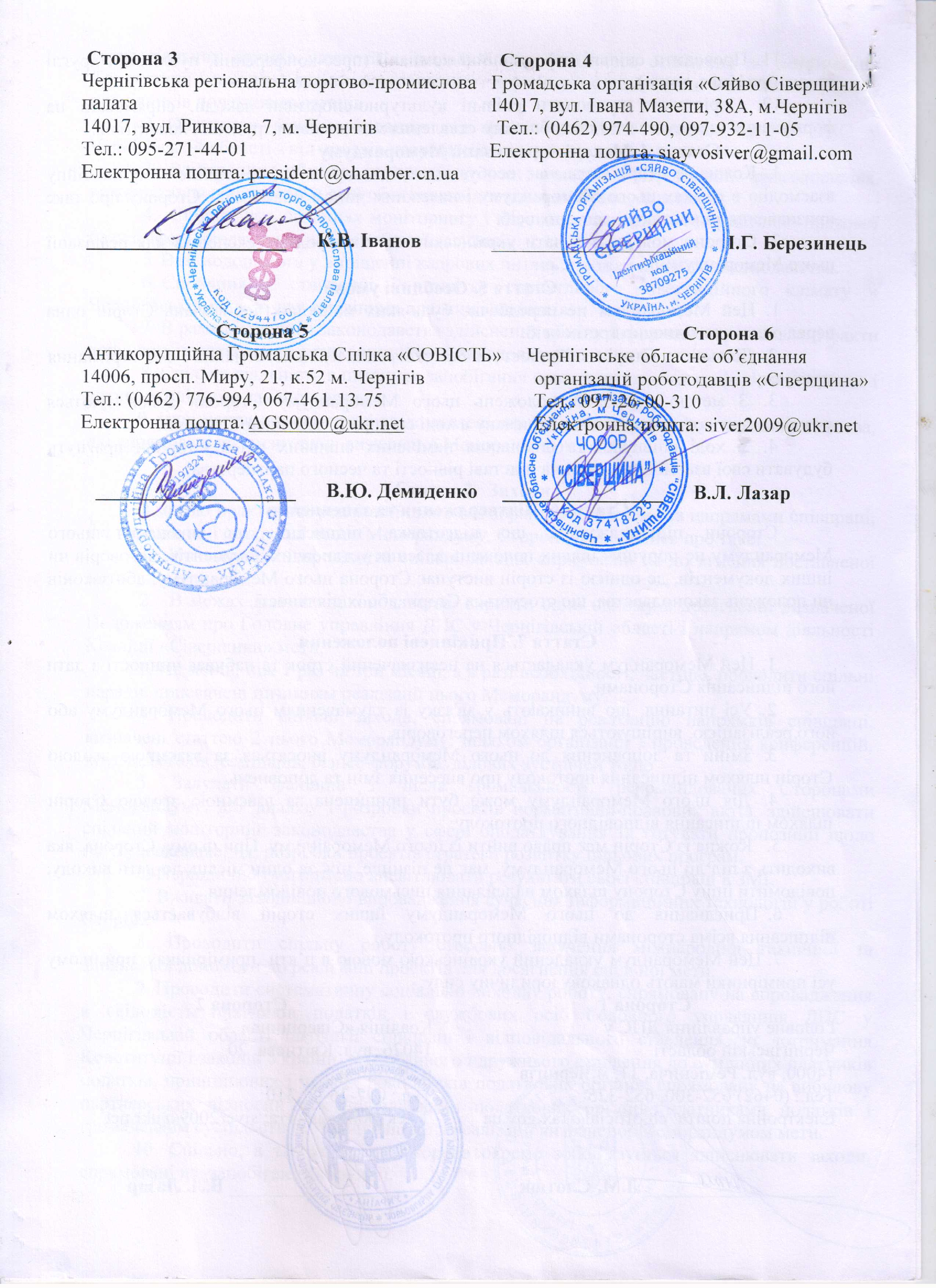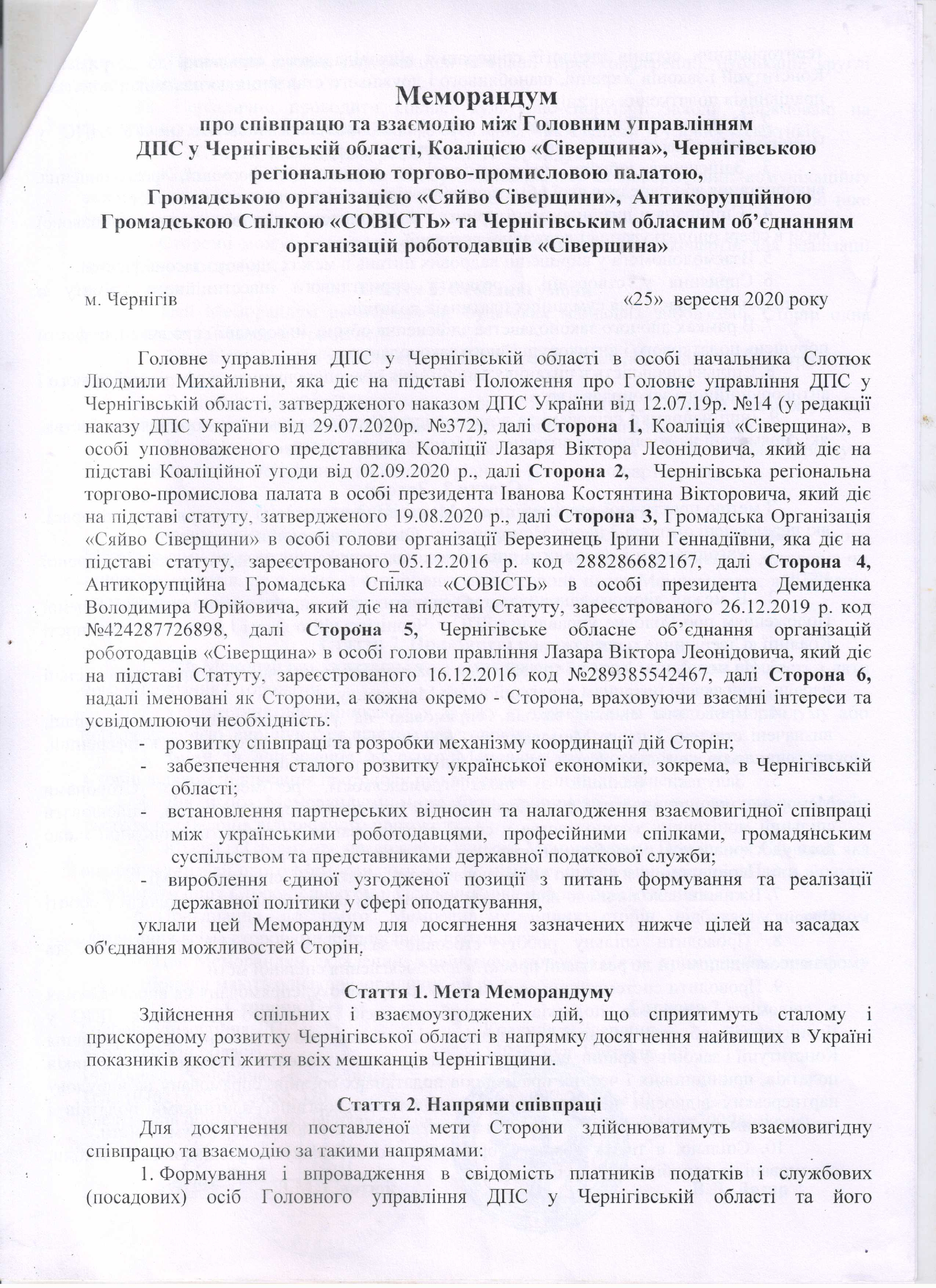 1.1.16. МЕМОРАНДУМ про СПІВПРАЦЮ та ВЗАЄМОДІЮ між Головним управлінням ДПС у Чернігівській області, Коаліцією «Сіверщина», Чернігівською регіональною торгово-промисловою палатою, Громадською організацією «Сяйво Сіверщини», Антикорупційною Громадською Спіл