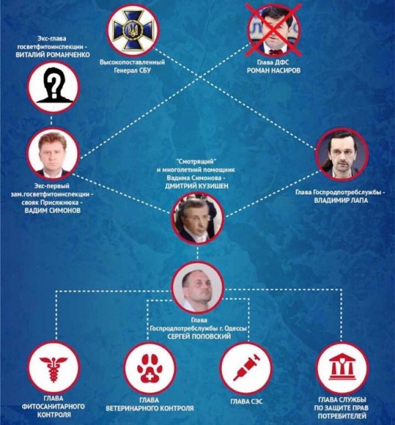 Кроме того, в этой коррупционной схеме непосредственно участвуют экс-глава госветфитоинспекции и нынешний советник главы Госпотребслужбы Виталий Романченко, экс-заместитель Кузишена и глава Госпродпотребслужбы г. Одессы Сергей Поповский, глава фитосанитарного контроля, одногруппник жены Поповского Кирилл Шестунов и, конечно же, председатель Госпродпотребслужбы Владимир Лапа.