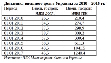 В 2016 году внешний долг Украины составил 118,7 млрд долларов, или 3086 млрд грн, что превышает ВВП страны в 1,3 раза. Для того чтобы рассчитаться по внешним долгам, государству нужно потратить четыре годовых бюджета страны.