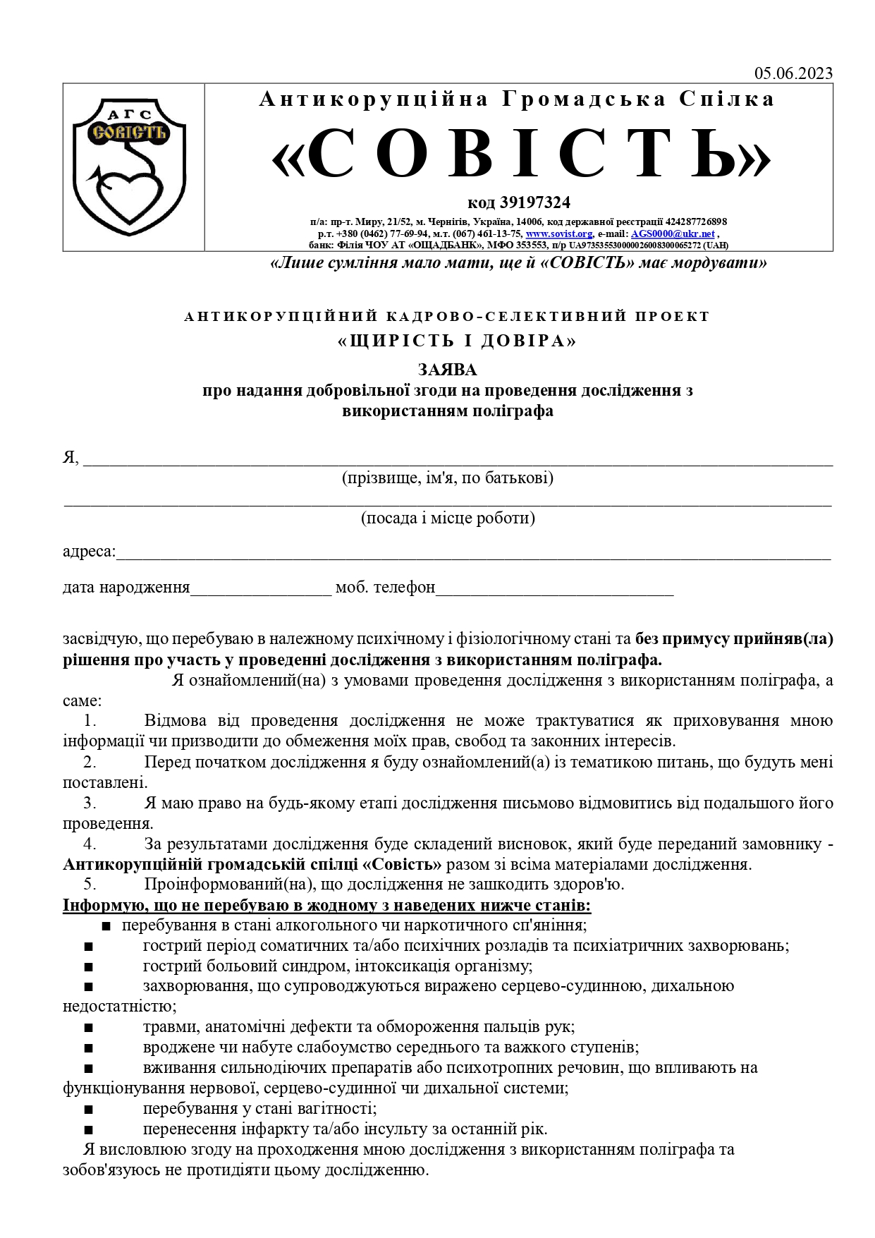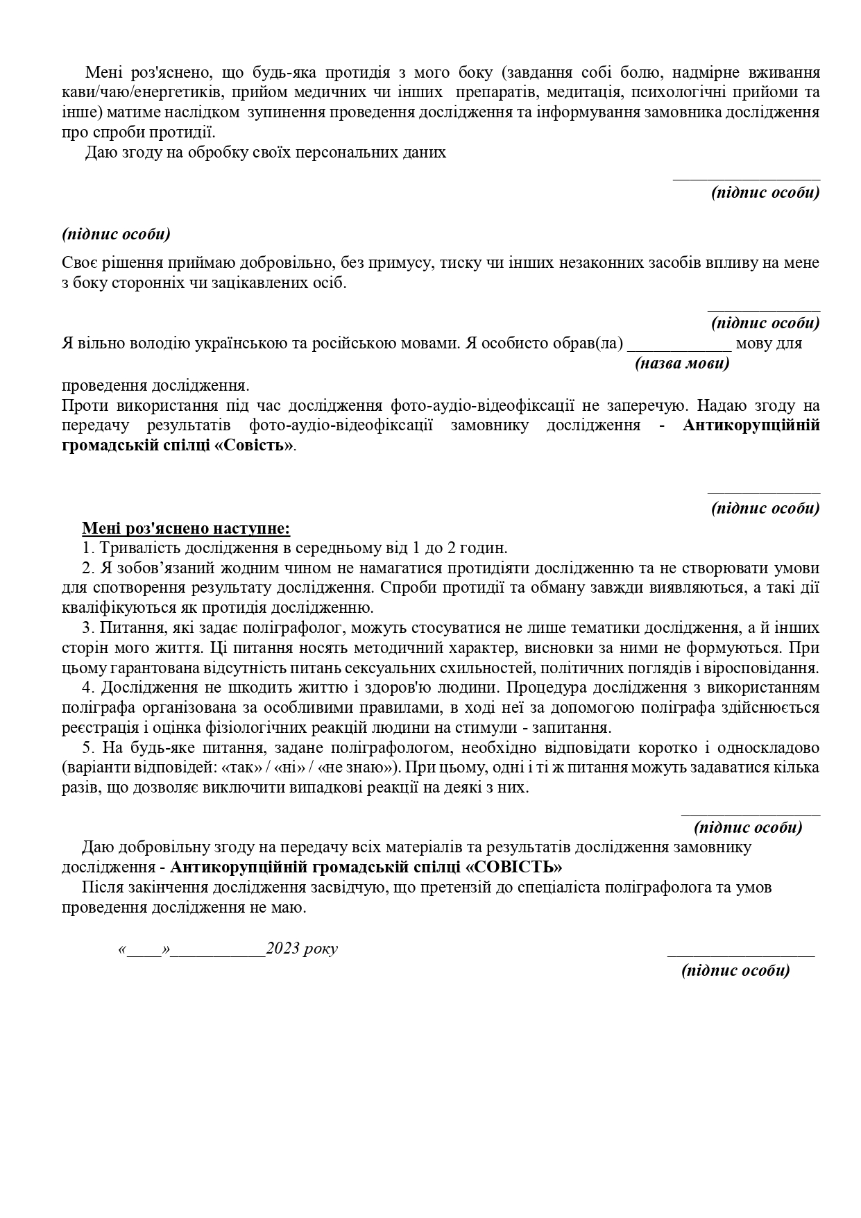 1.7.56. ЗАЯВА про надання добровільної згоди на проведення дослідження з використанням поліграфа