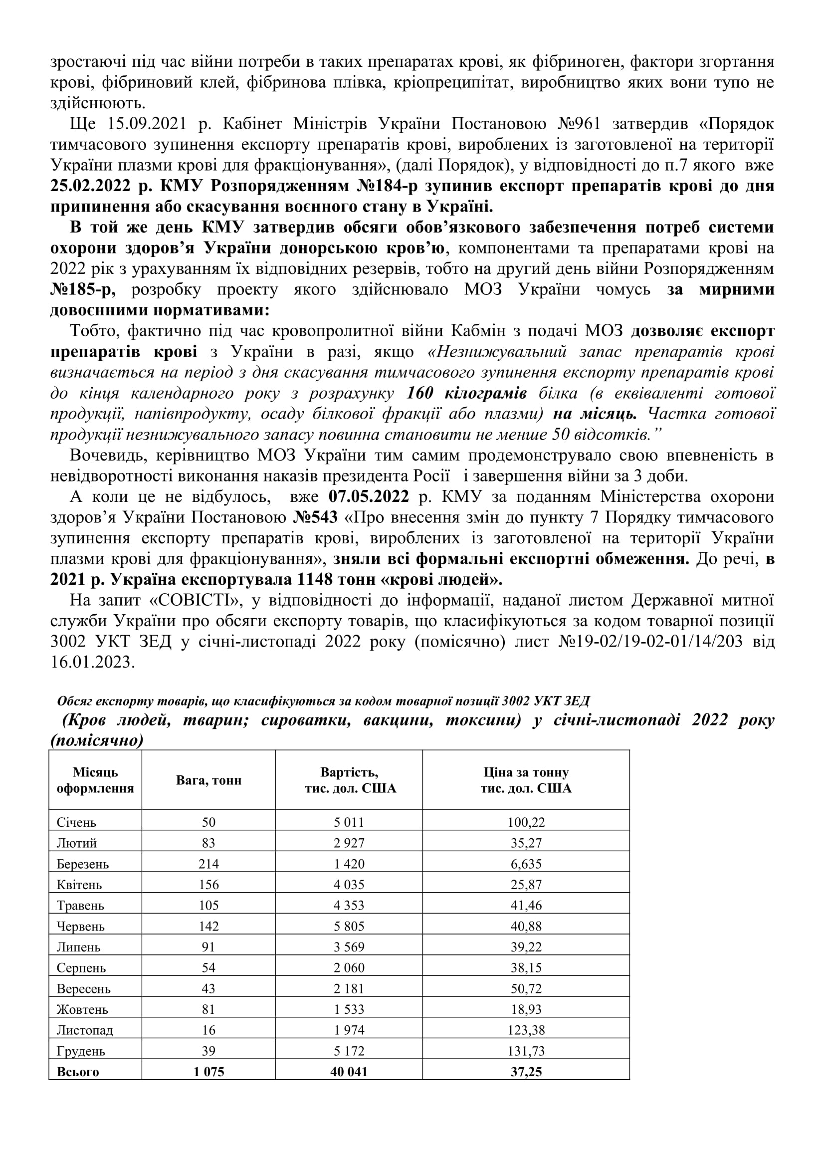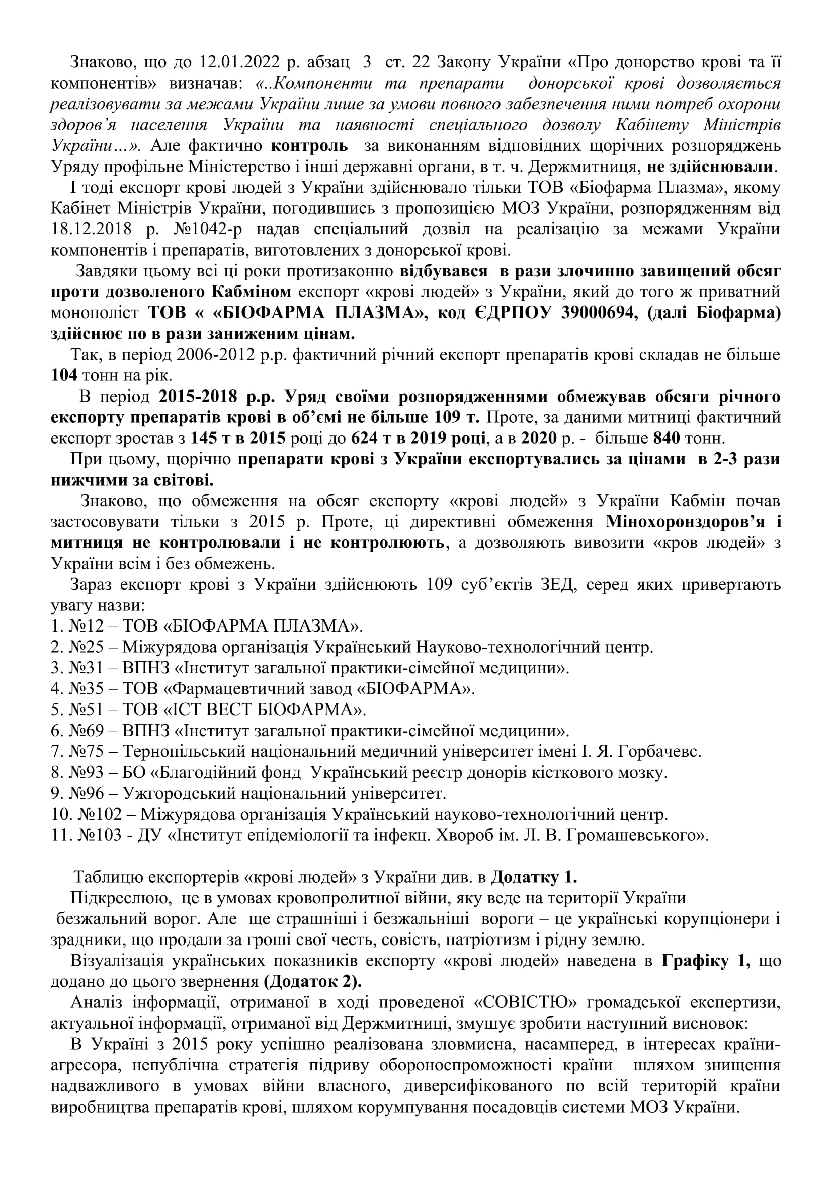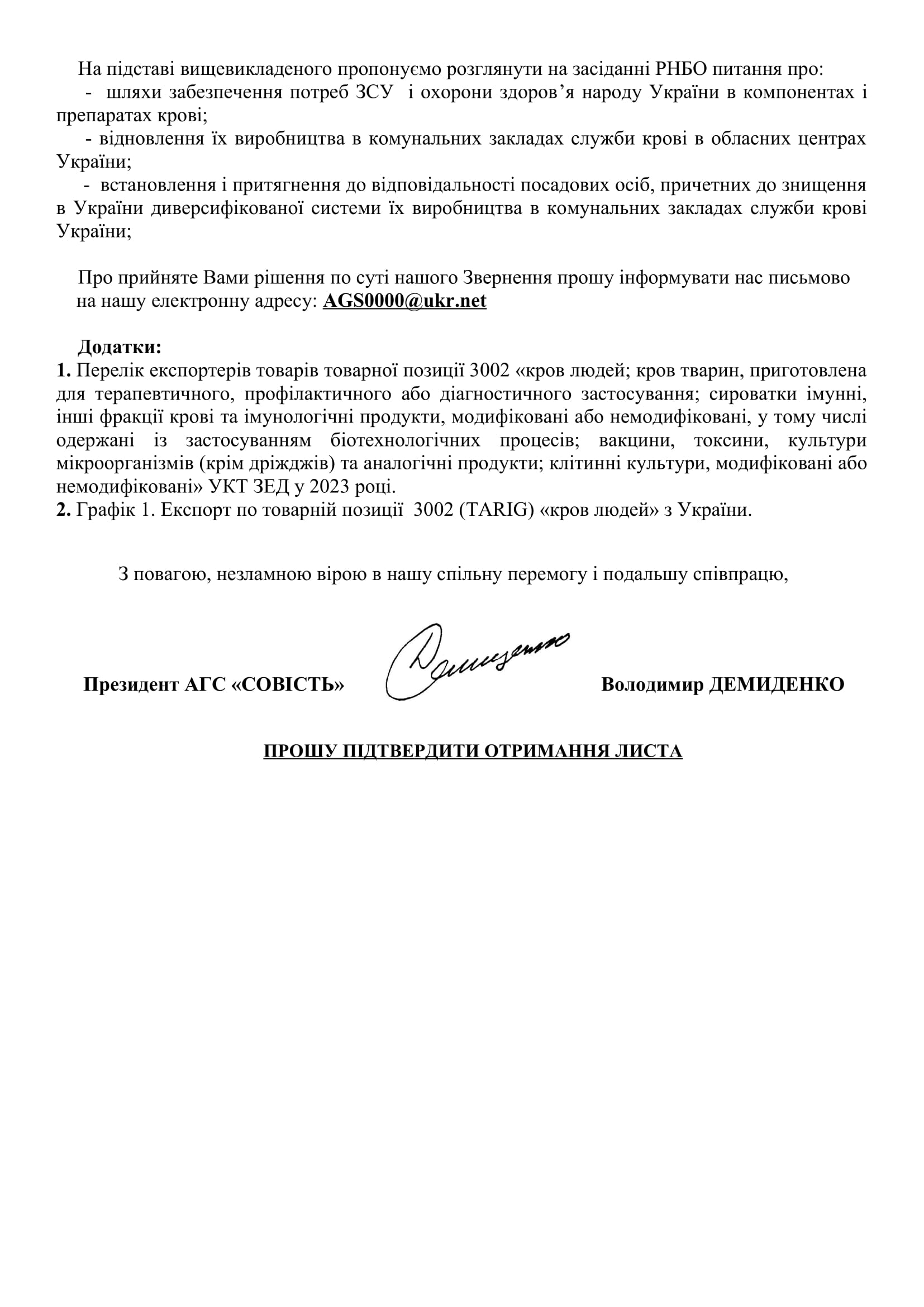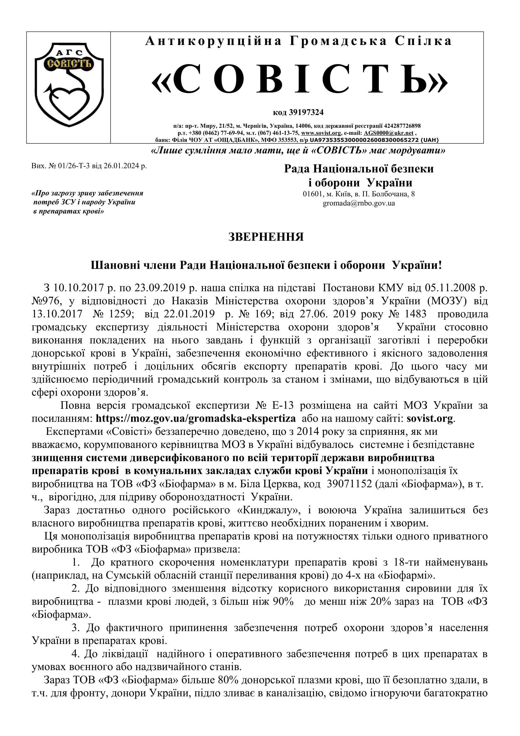 1.7.71. ЗВЕРНЕННЯ АГС "СОВІСТЬ" ДО РНБО СТОСОВНО ПИТАНЬ СЛУЖБИ КРОВІ В УКРАЇНІ