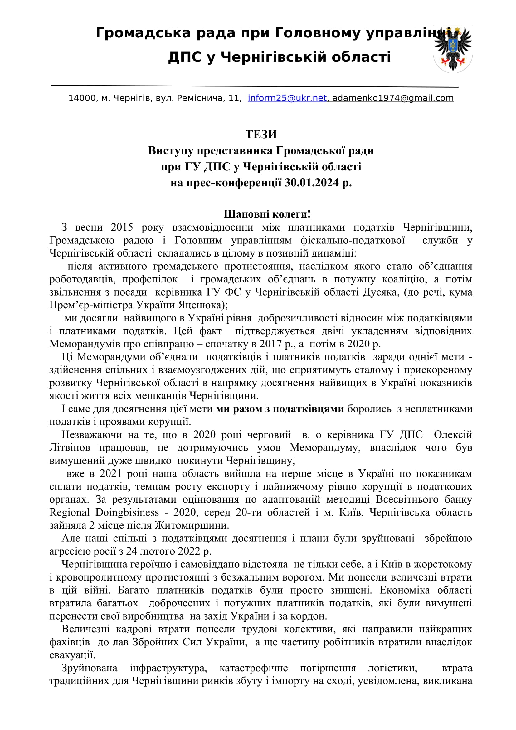 1.7.73. ТЕЗИ Виступу представника Громадської ради при ГУ ДПС у Чернігівській області на прес-конференції 30.01.2024 р.